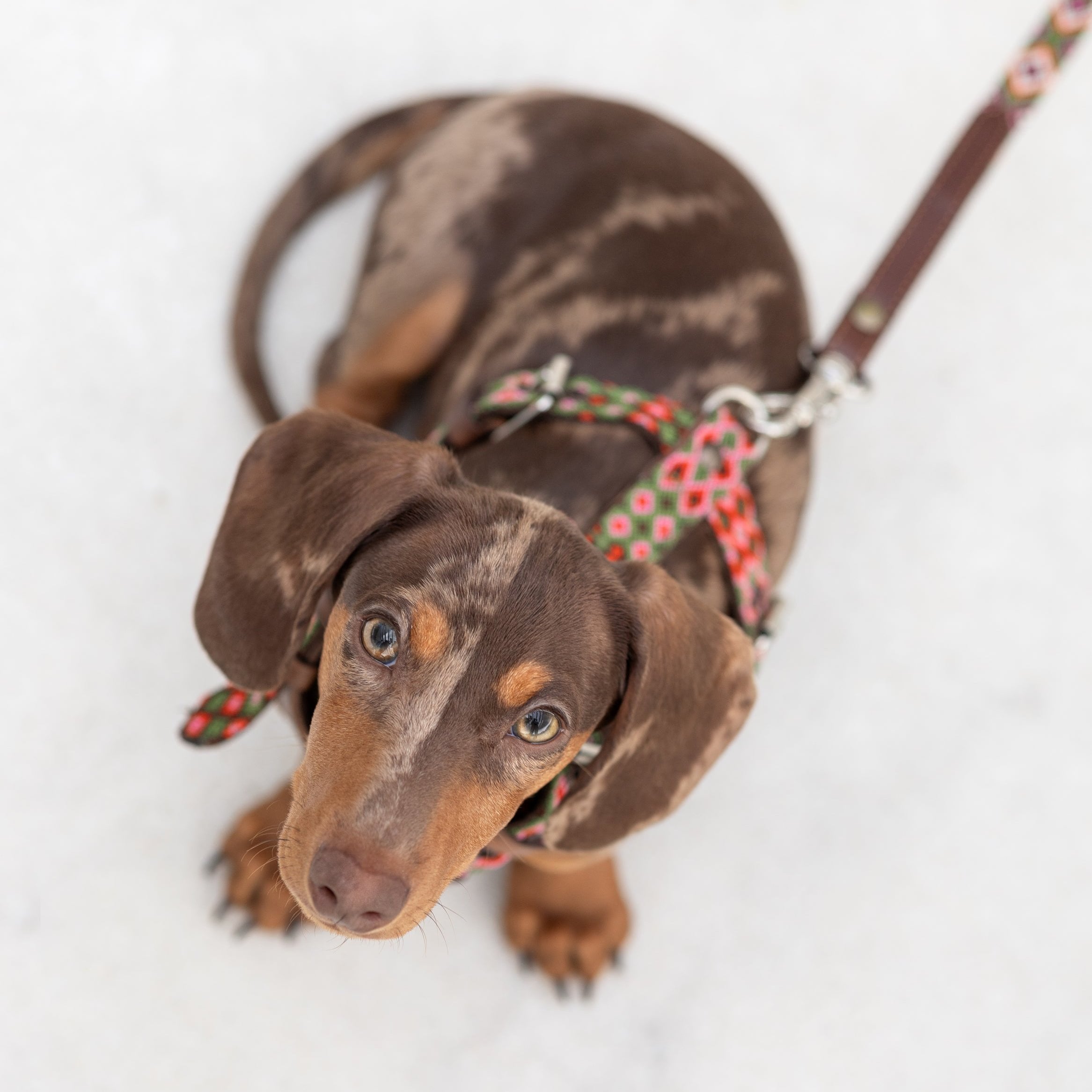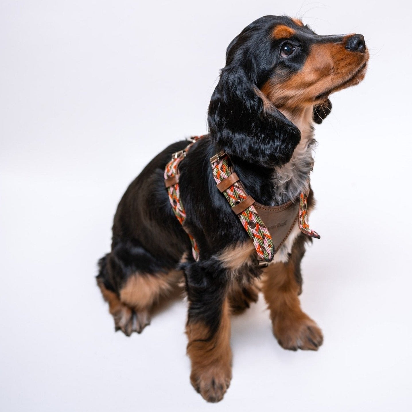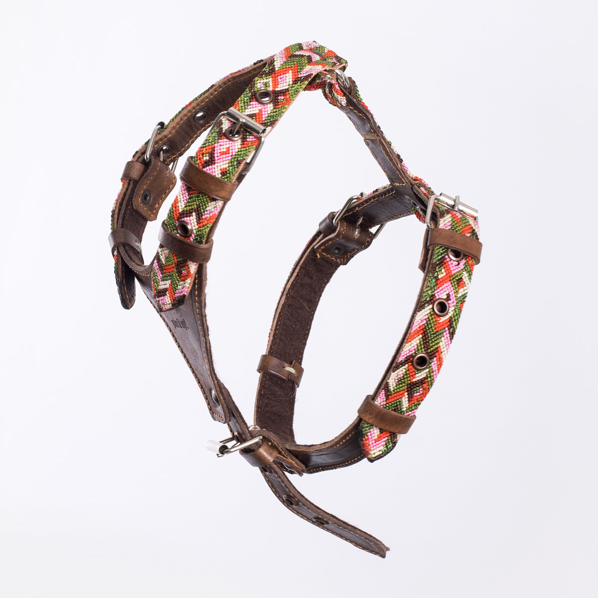 The Queretaro handmade dog harness combines Italian vegetable-tanned leather with handwoven macramé from Mexican artisans. This premium, durable dog harness offers comfort, strength and a unique artisan design for dogs of all sizes.