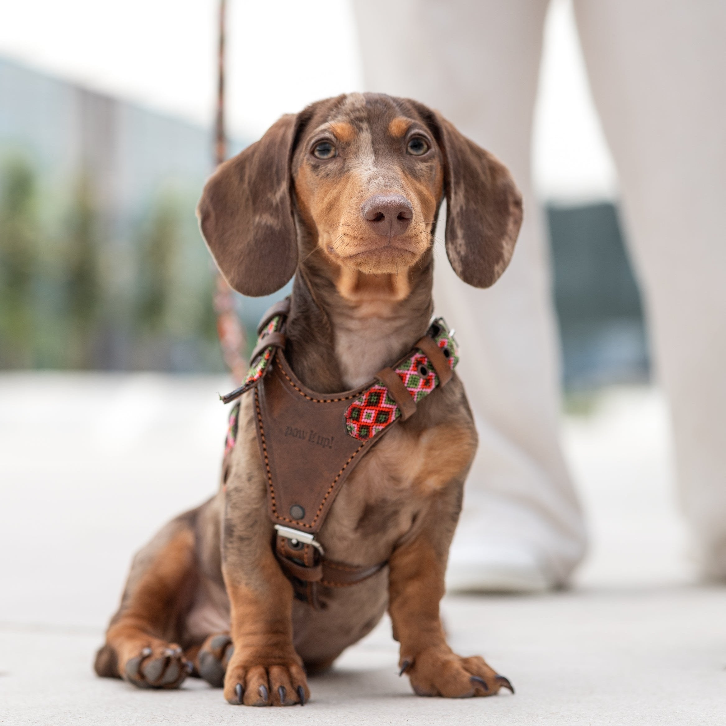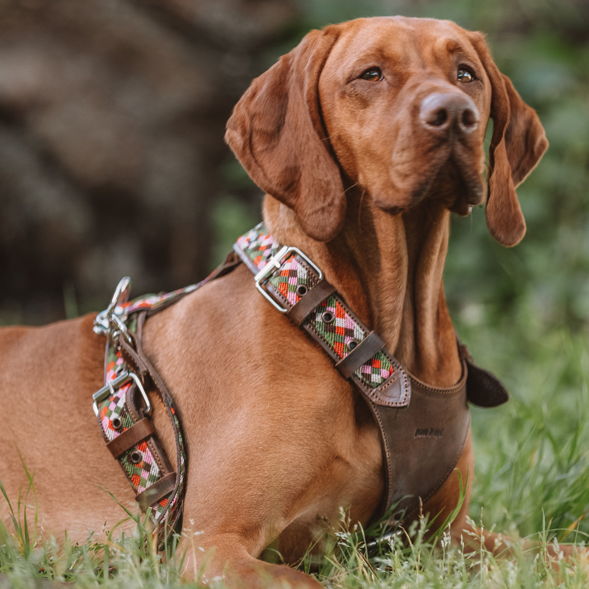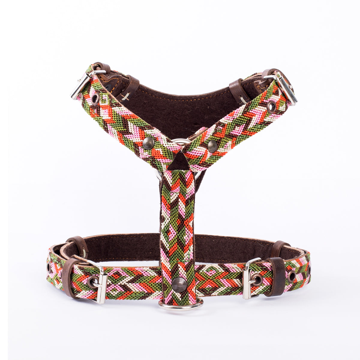 The Queretaro handmade dog harness combines Italian vegetable-tanned leather with handwoven macramé from Mexican artisans. This premium, durable dog harness offers comfort, strength and a unique artisan design for dogs of all sizes.