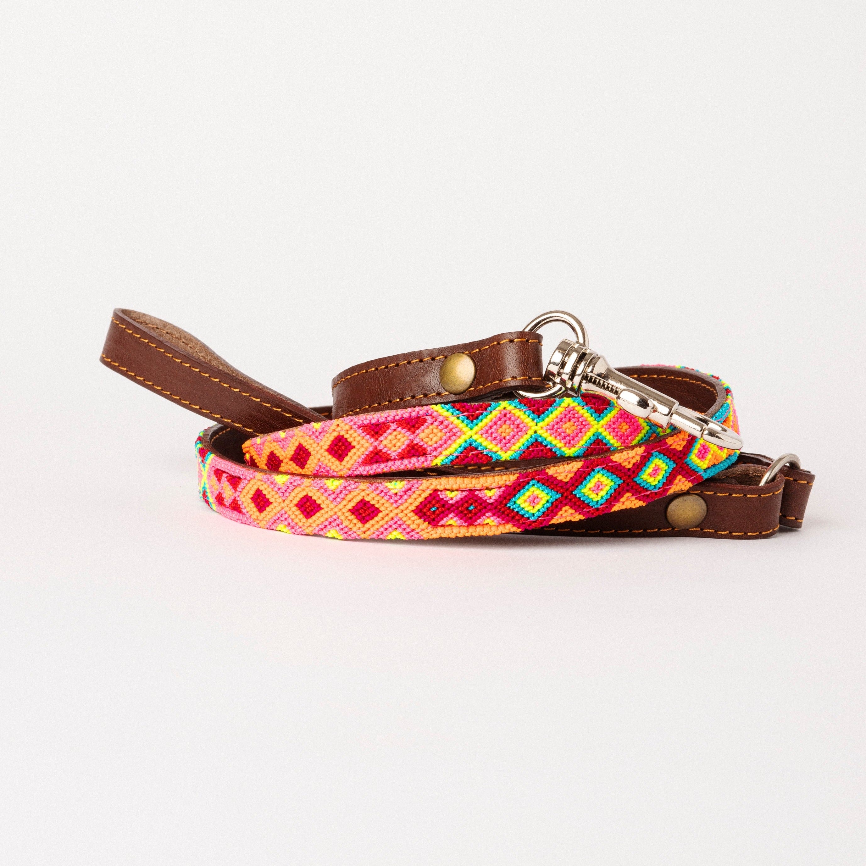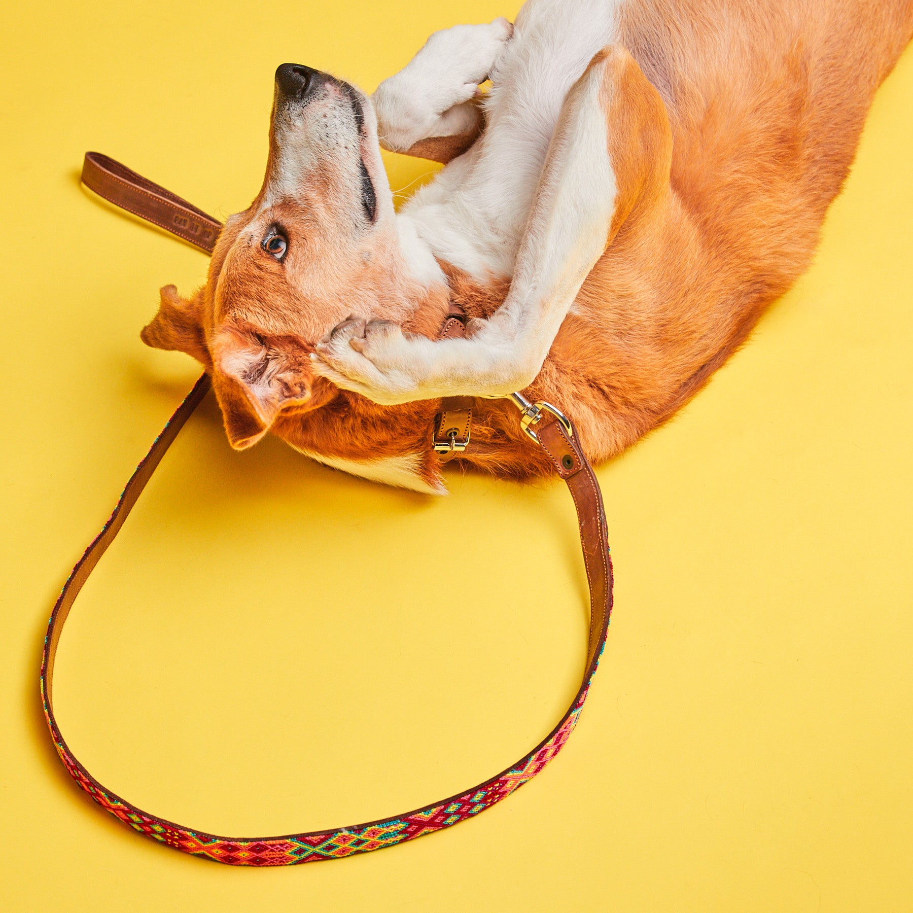 The Oaxaca handmade dog leash combines Italian vegetable-tanned leather with handwoven macramé from Mexican artisans. This premium, durable dog leash offers comfort, strength and a unique artisan design for dogs of all sizes.