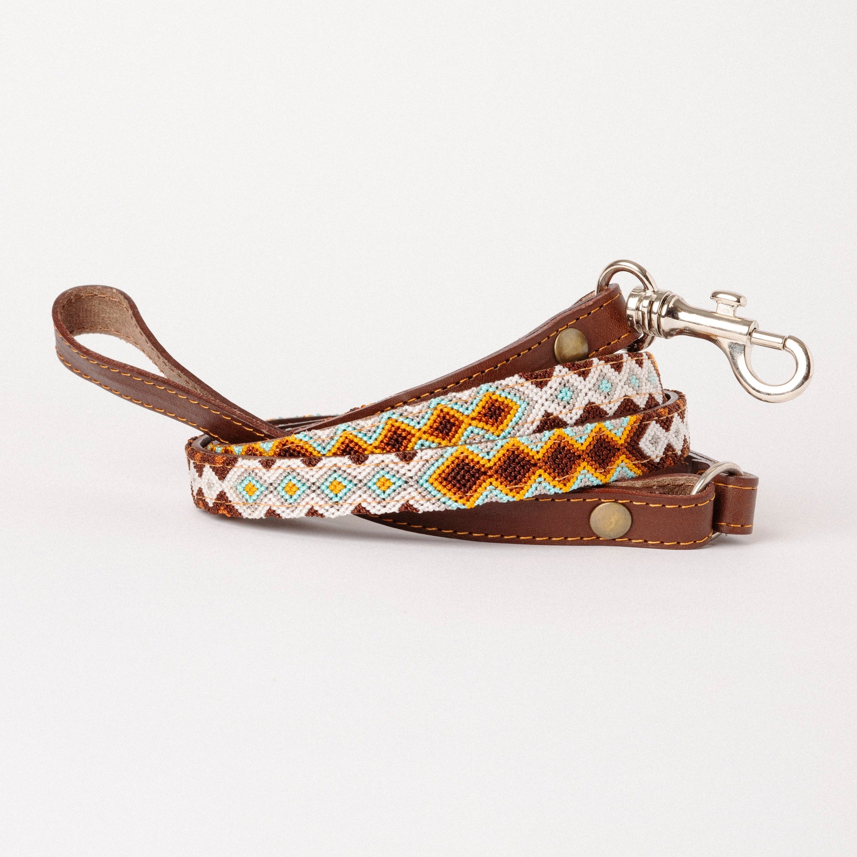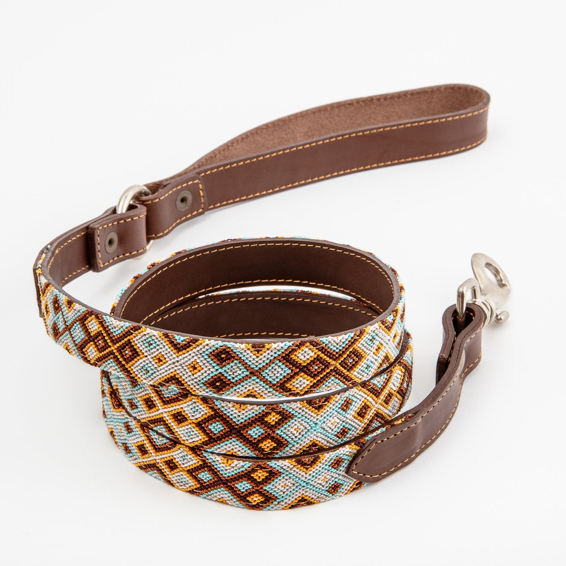 The Sonora handmade dog leash combines Italian vegetable-tanned leather with handwoven macramé from Mexican artisans. This premium, durable dog leash offers comfort, strength and a unique artisan design for dogs of all sizes.