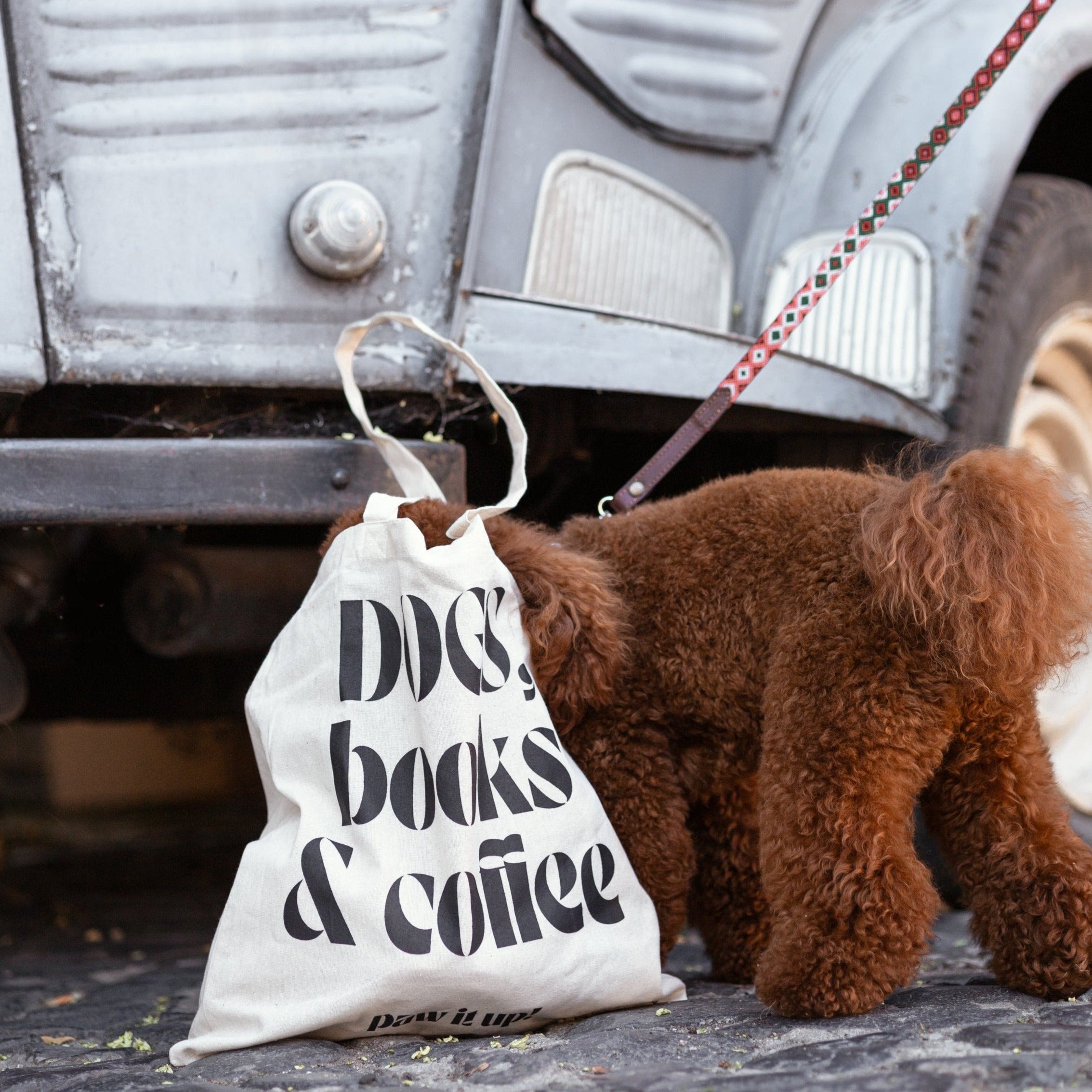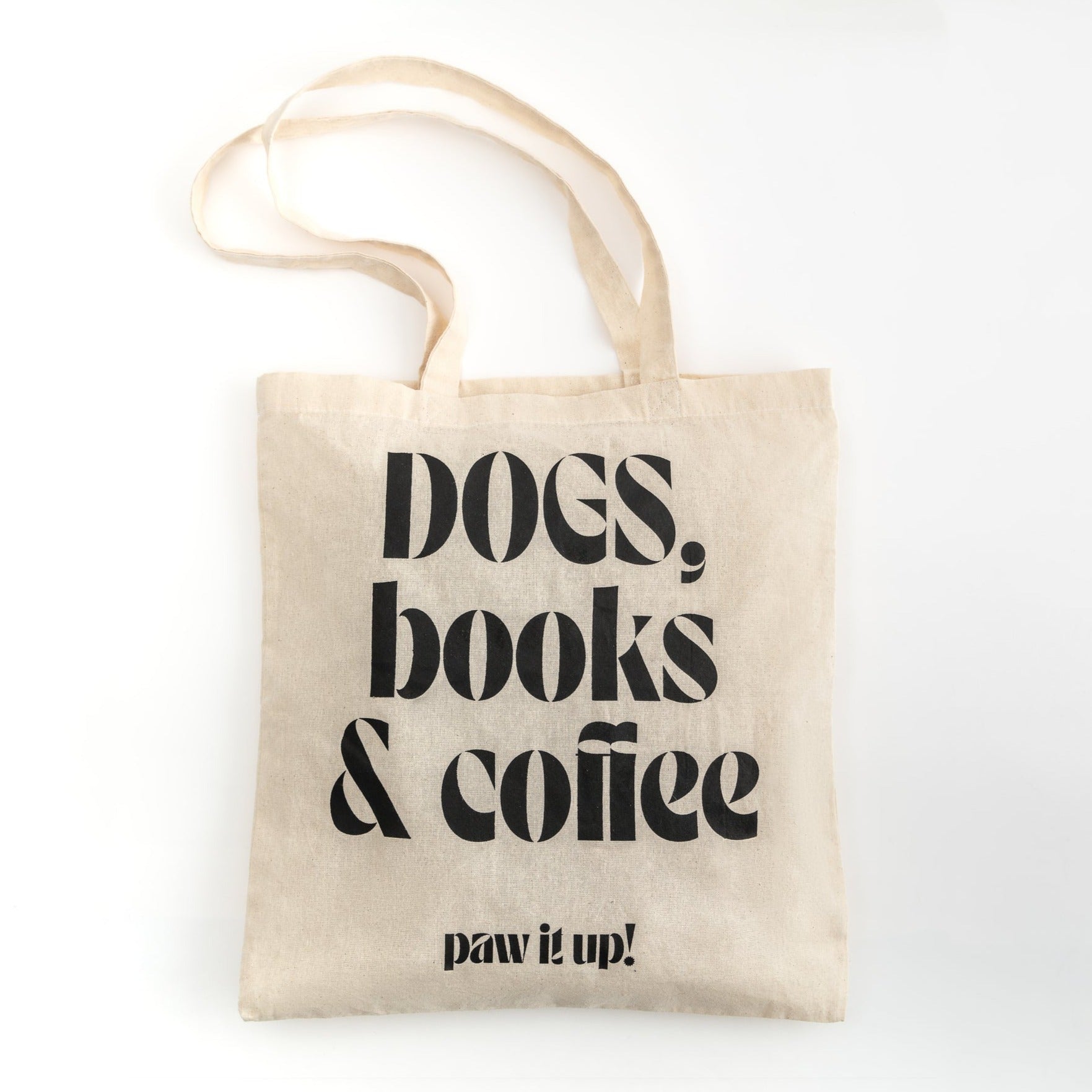 Descubre nuestra tote bag OEKO-TEX, la combinación perfecta de estilo. Nuestra elegante Tote Bag con el estampado «dogs, books & coffee» es versátil y perfecta para tus viajes de compras o para guardar todos los juguetes de tu amigo peludo.