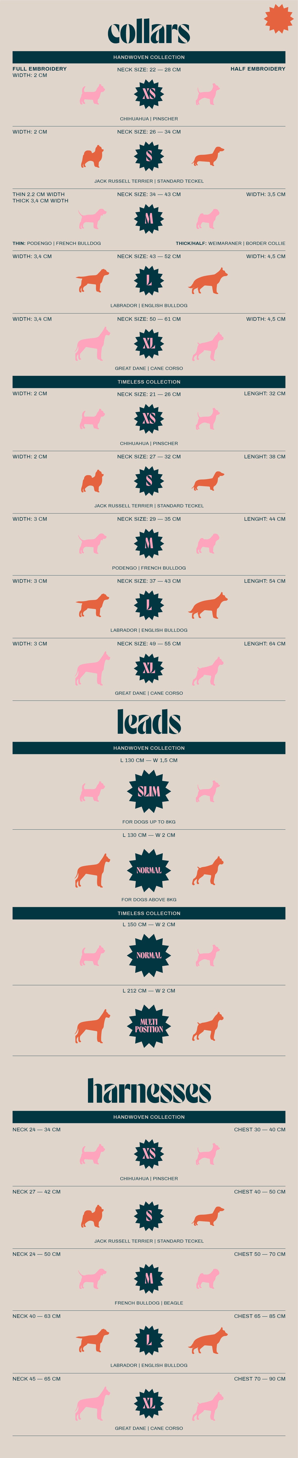 The illustrated breeds are only for guidance. We recommend that you always measure your dog's neck (collar and harness) and chest (harness) so that you can choose the right size. If you have any questions, please send us an email.